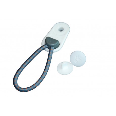 The white popper fitting attaches around the lower band of the awning, clipping through the storm guy tab. This fitting allows the included 10 rubber rings to attach to the awning. Guyline (not included) then ties through the rubber rings securing the awning to the ground.