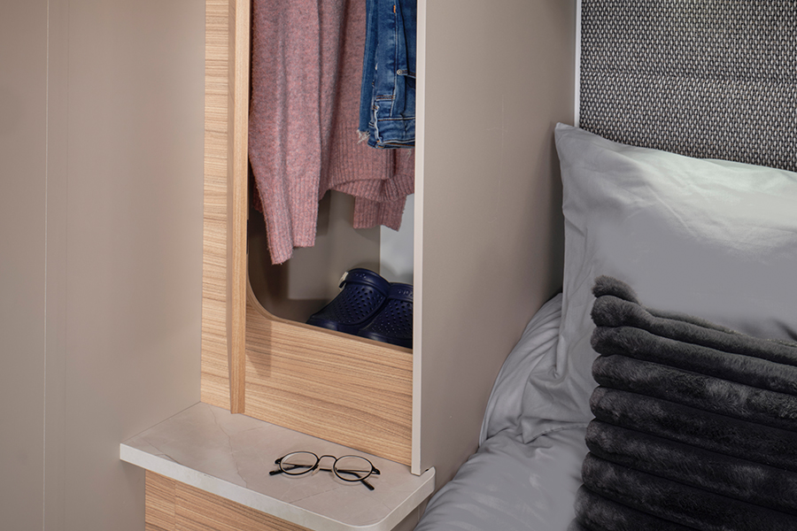 - Transverse retractable double island bed with twin wardrobes, bedside cabinets, and exterior-access under-bed storage